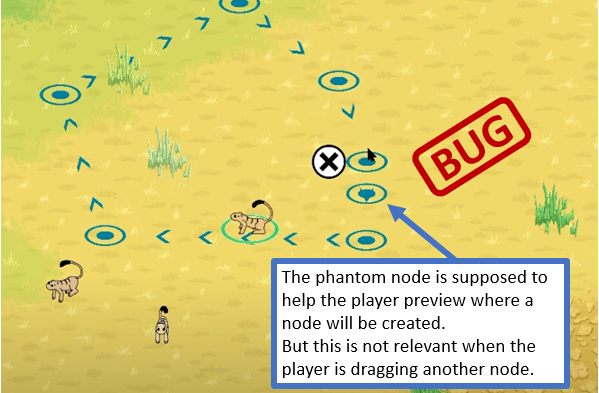 The secondary problem was in that the hover-feedback for the route-lines was appearing when it wasn’t relevant to the player. You can see this in the dev vlog video and in the image below: when I drag the node, a “ghost” node appears on the line.