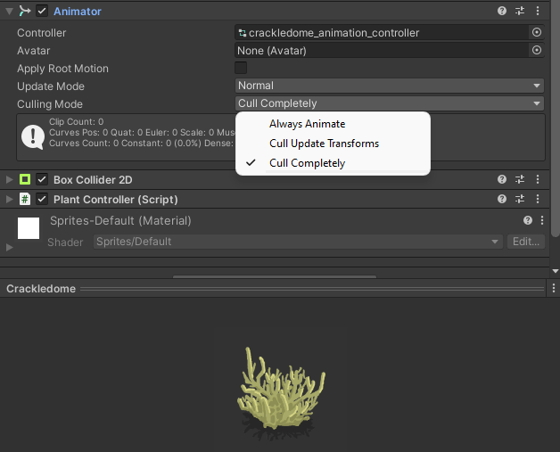 The reason I had the options were set to the less efficient “Always Animate” and “Never Sleep” was because I was still using tutorial-level settings from when I first started tinkering with Unity. I guess this is just part of becoming a more experience game developer!